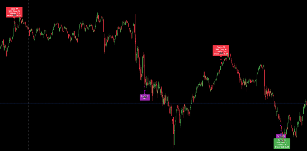 Paarse Vlakken (Exit): Dit zijn de sluitingsmomenten. Elke trade wordt strikt beheerd volgens een vooraf ingestelde Take Profit (om winst te verzilveren) of een Stop Loss (om het risico bij een tegenbeweging te beperken).